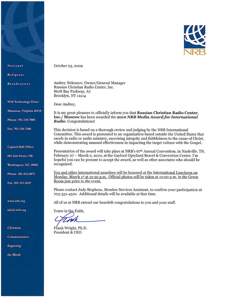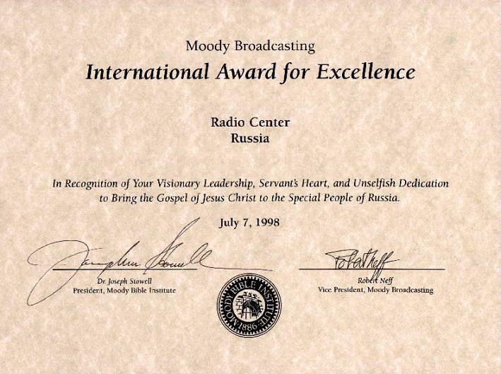 NRB INTERNATIONAL RADIO MINISTRY AWARD 2010 was presented to our Radio Center, Moscow, Russia