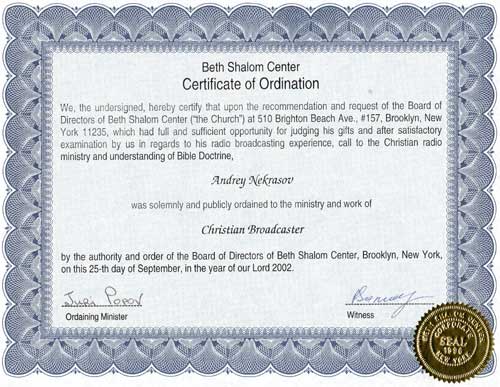 Certificate of Ordination